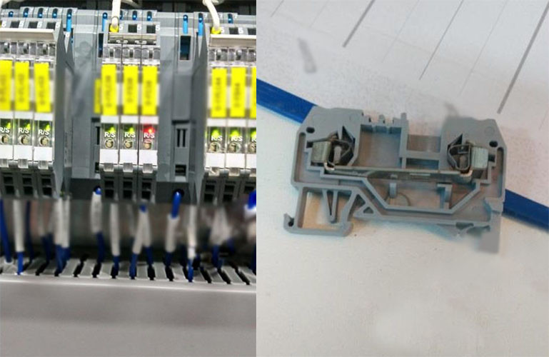 1.安装端子不规范,端子与端子之间排列很松,而且端子排两端没有安装锁紧固定件,造成在接线的时候导致弹簧金属元件从端子侧面出来。
