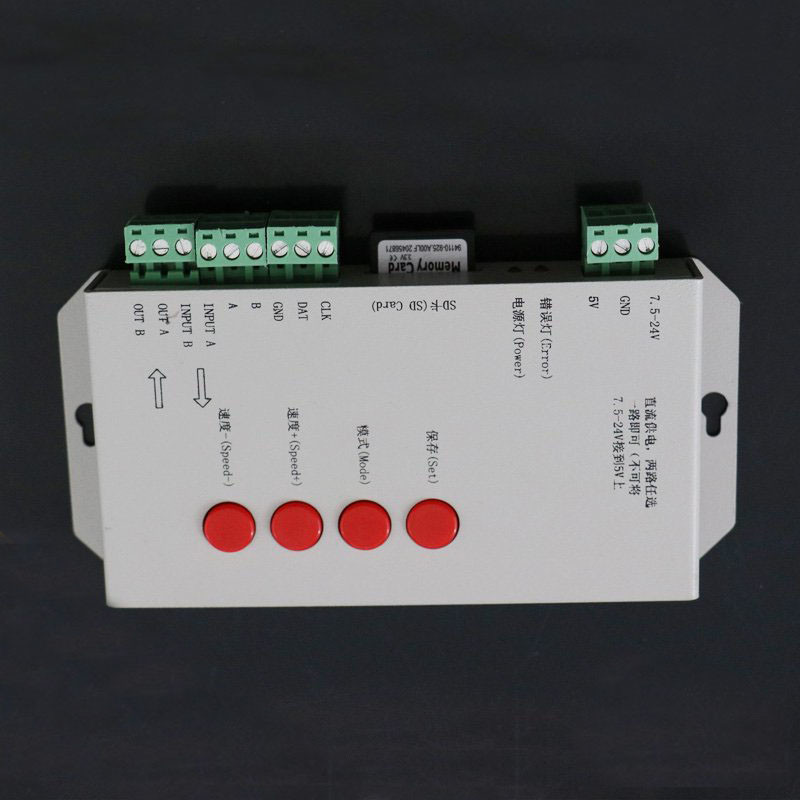 声控音乐幻彩控制器,主要用于幻彩LED模组、幻彩LED灯条等产品的智能声控。主要功能是通过处理咪头和音频头的声音信号,解析出声音的频谱对应关系,利用音频信号进行 LED 灯的花样的实时控制。不需要专业的控制器和控台就能实现灯由声动的规律变化。