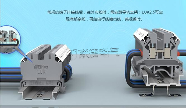传统的端子排在接线后,往外布线时需要安装导轨支架,增加了布线的复杂性。而LUK1-2.5则实现了底部穿线的设计,配合行线槽的出线方式,使得布线更加美观、整洁,且省时省力。这种设计不仅提升了工作效率,也为用户提供了更好的使用体验。