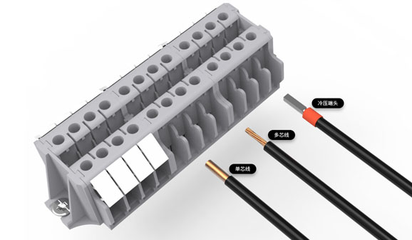 端子两侧卯榫结构设计,可与多种接线端子拼接,如LD系列。实现多接线方式共存,框式压线与弹簧压线同时使用。