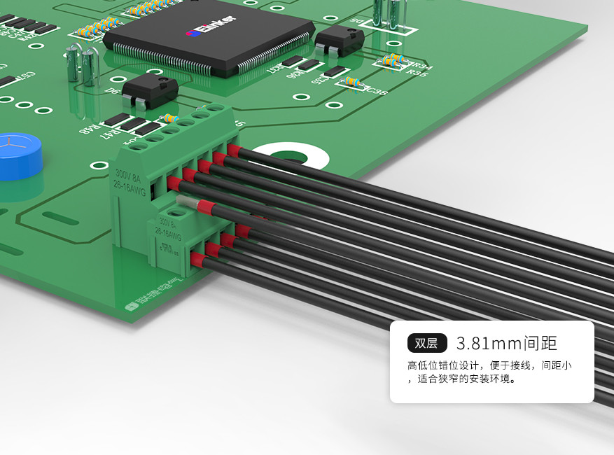 结构化设计兼顾了接线方便和牢固的特点,上下层错开半个针距便于接线。
